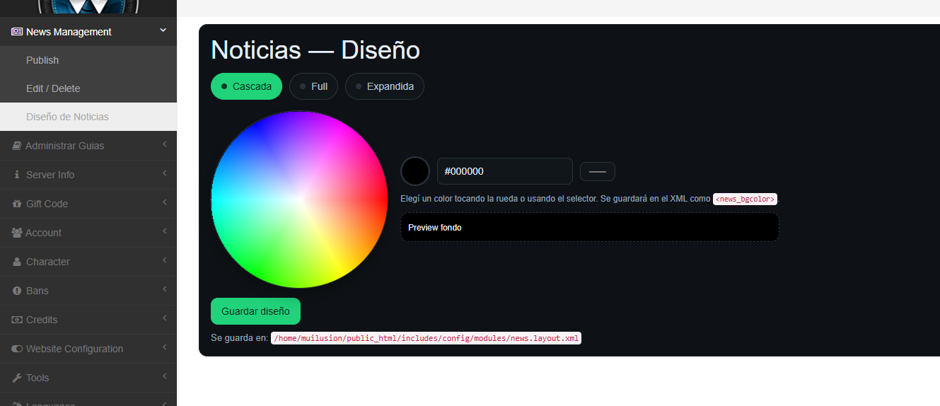 Admin completa, multilenguaje y personalización (background, vista corta/larga, límites).
