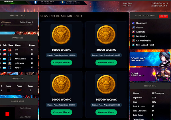 • ConfigLite: U$DT 300 - Configuración completa (no custom), versiones 97 – Season 6, WebEngine + background + logo + donaciones, EventItemBag / Shop / CashShop incluidos. ConfigCore: U$DT 400 - Todo lo anterior PLUS: WebEngine + plugins + donaciones + rediseño completo, seguimiento Beta (10 días), soporte WhatsApp prioritario, consultoría estratégica.