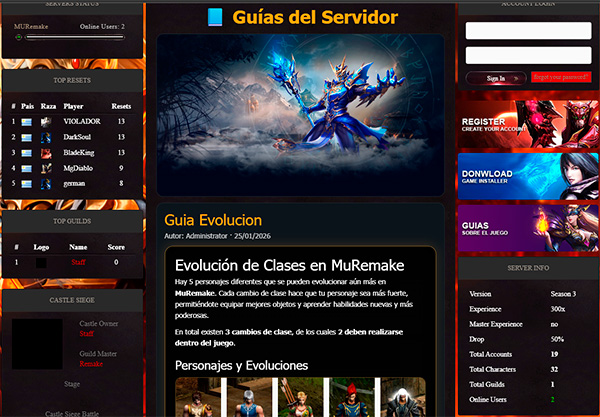 Suite completa para servidores MuOnline: interfaz moderna, donaciones integradas, rankings, perfiles, guías y más.