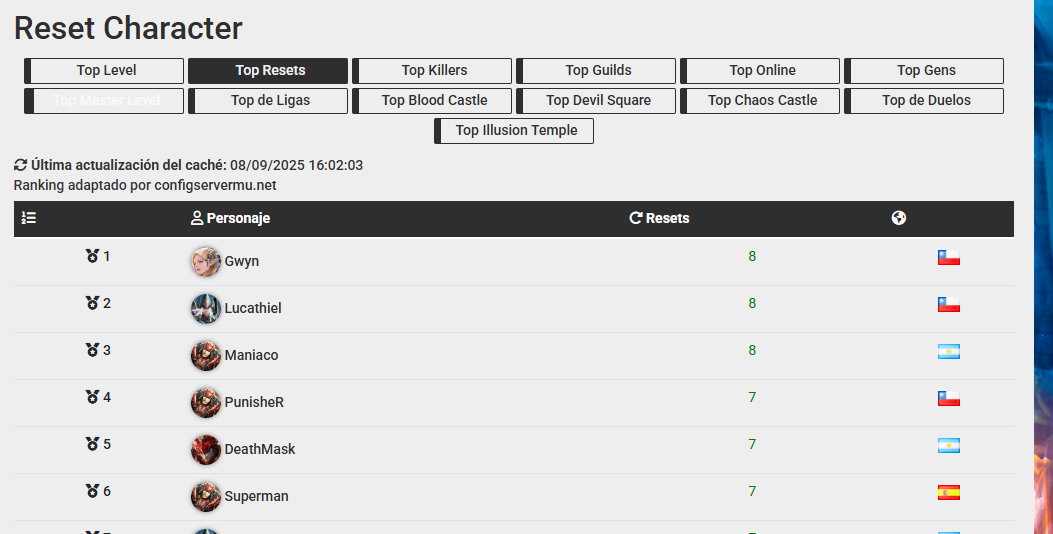 Profile Control para elegir qué datos mostrar (resets, clase, PvP, etc.).