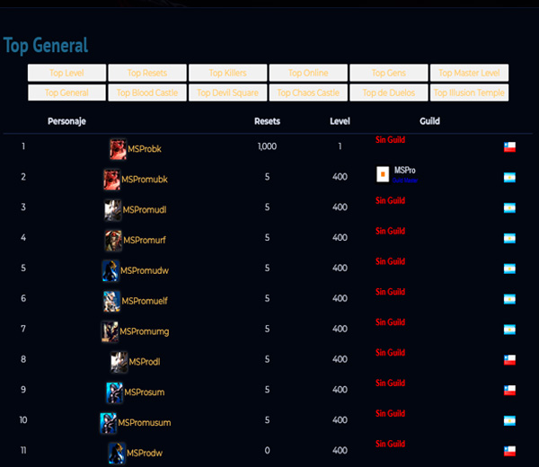Rankings de personajes, resets, guilds y más. Integración con perfiles.